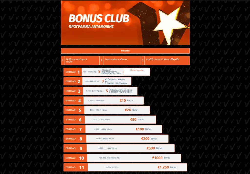 - Επίπεδο 11 (μέγιστο): με συγκέντρωση 150.000 πόντων – ο παίκτης λαμβάνει μπόνους 1250€.