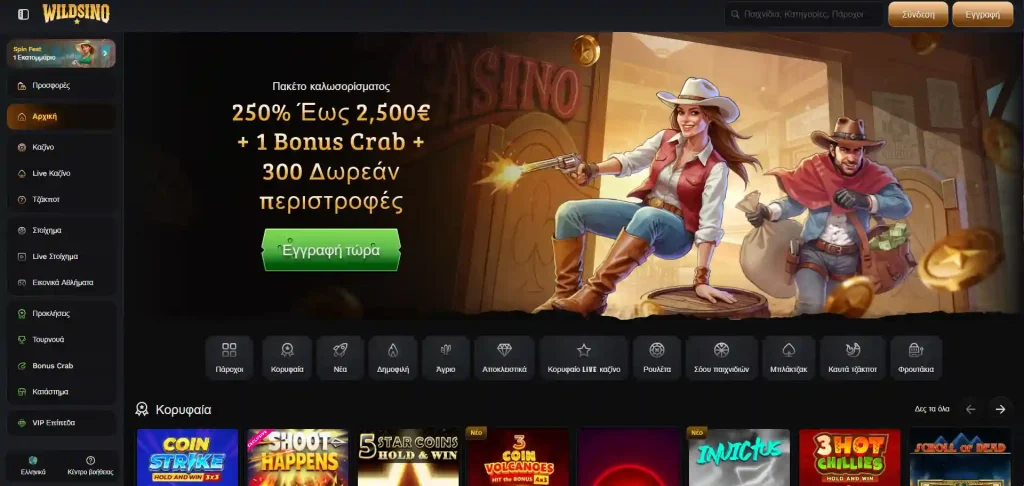 Το Welcome bonus casino στο Wildsino είναι μια λαμπρή αρχή για νέους παίκτες, ειδικά αν είστε έτοιμοι να κάνετε αρκετές καταθέσεις. Σας περιμένουν έως €2500, 300 δωρεάν περιστροφές και η ευκαιρία να παίξετε στο πρωτότυπο mini-pαιχνίδι Bonus Crab με πραγματικά μπόνους.