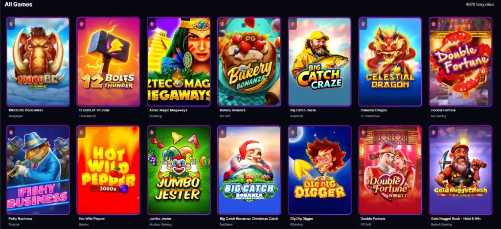 • Σλοτ (Slots): Η μεγαλύτερη ενότητα, που περιλαμβάνει κλασικές μηχανές, βιντεοσλοτ με μπόνους γύρους και παιχνίδια με μηχανική Megaways.